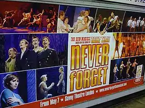 The musical Never Forget premiered at the Wales Millennium Centre, Cardiff, in July 2007 prior to a short UK tour.[2] The show was nominated for the 2008 WOS Theatregoers Choice Award for Best Touring Production and received generally favourable notices. It then re-opened at The Churchill Theatre, Bromley, London, in March 2008 for a second six-city pre-West End tour.[3]
