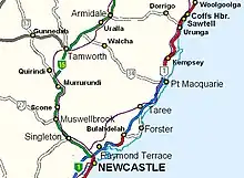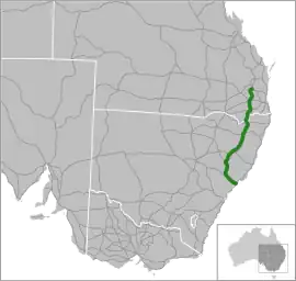 New England Highway is an 883-kilometre (549 mi) long[1] highway in Australia running from Yarraman, north of Toowoomba, Queensland, at its northern end to Hexham at Newcastle, New South Wales, at its southern end. It is part of Australia's National Highway system, and forms part of the inland route between Brisbane and Sydney.[3]
