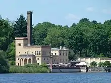 The palace kitchen, built between 1788 and 1790, an artificial ruin facing lake Heiliger See, was designed to look like a half-buried temple near the foot of a flight of stairs leading down from a terrace of the Marble Palace, to which it was connected by an underground corridor.