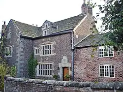 New Hall is a 17th-century house in Woodford, in the Metropolitan Borough of Stockport, Greater Manchester, England (grid reference SJ893813). Above the door, there is a Tudor-arched lintel with the date '1630' along with the initials 'WDED' (William and Elizabeth Davenport) and the family shield.[1] Another branch of the Davenport family owned Bramall Hall in Bramhall, close by. The house, along with an adjoining cottage, is a Grade II* listed building.[1]