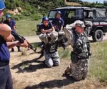 Albanian MPs search soldiers from the New Jersey National Guard during a training exercise.