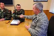 The Adjutant General of New Jersey shakes hands with the Chief of Defense, Albanian armed forces, during a meeting in New Jersey