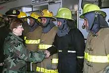 Brig. Gen. Maria Falca-Dodson (left) shakes hands with Albanian firefighters during a ceremony in which the New Jersey-Albania State Partnership Program donated a fire truck to the Albanian Fire Rescue Services Department.
