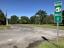 After a 1.99-mile (3.20 km) gap in the roadway, which consists of a former bridge over the Mullica River dismantled and moved to Virginia, bridges removed for wetlands mitigation in the marshes just north, and the orphaned roads in between (which are visible from the Garden State Parkway to the west), Route 167 resurfaces in Bass River Township as a short dead-end street only approximately 800 ft (0.24 km) long, serving only a few homes. The route intersects Bogan Lane and comes to an end at an intersection with US 9.[1] The route's official speed limit, which is not signed, is 25 mph (40 km/h) at its southern segment and 50 mph (80 km/h) in its northern segment.[2] However the Straight Line Diagrams produced by the Department of Transportation list the southern segment as 25 miles per hour (40 km/h) and the northern as 20 miles per hour (32 km/h).[1]