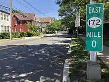 Route 172 is a short state highway in New Brunswick, New Jersey, United States. The designation runs along the southernmost leg of George Street, which is county and city-maintained the rest of the way. Route 172 is 0.69 miles (1.11 km) long, serving as a connector from an intersection with County Route 527 (CR 527) and Paul Robeson Boulevard to an interchange with Route 18. The highway was assigned in the 1950s, when nearby Route 18 was realigned onto a new freeway over Burnet Street in New Brunswick. Route 172 underwent a major upgrade during the reconstruction of Route 18, including a roundabout at an intersection with CR 617, and a brand-new interchange with the local lanes of Route 18.