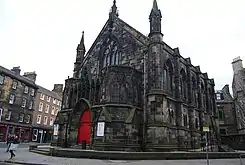 The resulting building is, in the words of the Buildings of Scotland guide to Edinburgh, "a thinly detailed early Dec rectangle".[39] The church consists of a wide nave under a pitch roof. At the exterior side walls, heavy buttresses divide the nave's five bays while a shallow parapet runs along the top. A couse of moulding divides each bay into two storeys, with a simple traceried in the top storey and smaller twin lancets in the bottom. A shallow, polygonal apse defines the building's southern end. The front elevation at the northern end consists of twin, two-storey, semi-octagonal stair towers on either side of a projecting porch. Heavy buttresses support the lower storeys of these towers while the upper storeys are decorated with blind tracey, which is continuous with an openwork screen above the arched doorway. The wide gable of the north elevation contains a traceried window and is flanked by octagonal turrets with pinnacles. The apex of the gable includes a niche and is capped by a pinnacle. The interior retains its gallery, supported on cast iron columns; while the apse still contains the organ loft and Gothic screens. Over the nave is a single-span timber roof.[39][40]