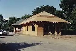 The original New Paltz station burned down around 4:45 A.M. on April 23, 1907, damaging freight and killing station agent E. J. Snyder's dog. The fire originated in the office stove, and spread rapidly before local fire companies could arrive.[46] A passenger car was used as a temporary station while the building was rebuilt.[47] By late September 1907, the concrete foundation and the framework of the new building had been put in place,[48] but work on the interior did not begin until November because the lumber had not arrived.[49] The depot was completely rebuilt by December 31, 1907,[50] and in active use by February 7, 1908.[51] While the original station had a gabled roof, the rebuilt station was hipped. The direction of the new station's battens was horizontal; the original station had had vertical slats.[20] The rebuilt freight house was placed a distance from the depot.[52]