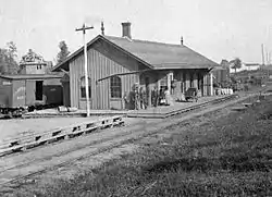 By November 1869, the Gardiner rail depot, to the south of New Paltz, was ceremoniously opened by the railroad's president, Floyd McKinstry. The station immediately began to see regular traffic.[10][11][12] A second Gardiner station was constructed in the hamlet of Forest Glen, in the northern part of Gardiner.[13] The railroad company was contractually obligated to start construction in New Paltz by May 18, 1870,[14] and work on the New Paltz station commenced that day. The depot was designed to be 20 by 80 feet (6.1 by 24.4 m).[15] The design included freight and baggage rooms, as well as a water tank and engine house. The station had two waiting rooms, while most stations on the Wallkill line only had one. The New Paltz station, as with the other Wallkill Valley stations, was based on "standard patterns ... rather than [being designed] by individual architects".[16]