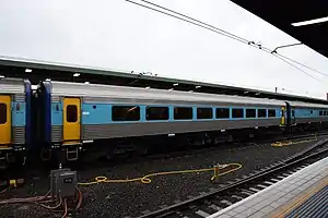 It was proposed to extend operations to Melbourne with costs to be shared with V/Line. A five-carriage promotional train ran to Melbourne on Sunday 17 February 1985, running four free return shuttles to Tullamarine Loop.[23] Crew training commenced on the North East line between Albury and Benalla in July 1985 with services scheduled to commence on 3 August, however agreement could not be reached with the Australian Federated Union of Locomotive Employees over crewing and the plan was shelved.[24][25][26] Another promotional train ran to Melbourne in November 1990.[27]