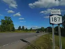 New York State Route 187 (NY 187) is a short state highway located entirely in Erie County, New York, in the United States. It serves as the southern end of the busy Transit Road in the town of Elma. Its southern terminus is at Quaker Road (U.S. Route 20A or US 20A) and its northern terminus at US 20 where that highway becomes Transit Road. Unlike much of the rest of Transit, which is mostly designated as part of NY 78, the NY 187 portion is lightly trafficked, two-lane and largely undeveloped. NY 187 was assigned in the early 1940s and was previously part of NY 78.