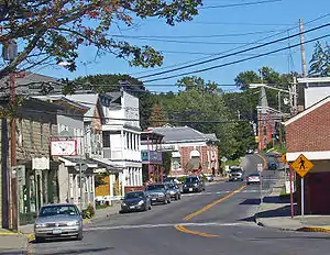 In the center of Mellenville, NY 217 intersects with CR 9 (Mellenville Road), with NY 217 serving as CR 9's southern terminus. NY 217 then heads southeast, crossing Claverack Creek and passing Mellenville Union Cemetery to the north as well as the adjacent Claverack Town Park. The route turns eastward and meets the northern terminus of Roxbury Road as it enters the village of Philmont. Within Philmont, NY 217 follows Main Street through the center of the densely populated village. At an intersection with Maple Street, the highway comes within view of Summit Lake, a small water body in the center of Philmont. Past the lake, NY 217 turns northeast once more and intersects with CR 11 (Martindale Road) as it leaves the village.[3]