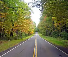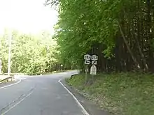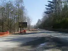 Not far from Beaverkill Road is the east end of the spillway road, which was closed as a security precaution following the September 11, 2001 attacks, but reopened after construction of a new alignment of NY 28A was completed in 2012.[6][9] Past the spillway road, NY 28A continues east, briefly crossing the Blue Line and leaving Catskill Park as it passes another spillway.[8] At the spillway's southeastern tip is a junction with Stone Church Road,[6] where the route turns back to the north and reenters the park.[8] Now in the town of Hurley, NY 28A continues to follow the irregular reservoir shoreline to the northeast, but on an alignment slightly farther inland than before. The land here remains wooded, but more frequently broken by houses on the southern side.[6]