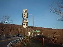 In the mid-1920s, the segment of modern NY 51 between West Burlington and West Winfield was designated as part of NY 44, a route that extended south from West Burlington to Sidney and north from West Winfield to Utica. At the time, this was the only substantial segment of what is now NY 51 to have a route number even though all of modern NY 51 south of Ilion was state-maintained.[7][8] In the 1930 renumbering of state highways in New York, most of NY 44 became part of NY 8. The section from West Burlington to West Winfield, however, became part of the new NY 51,[2] which utilized all of its modern routing from Mount Upton to Ilion upon assignment.[9] It was extended across the Mohawk River to NY 5 in North Ilion in the mid-1960s.[10][11]