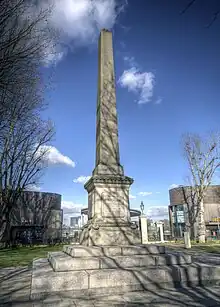 The obelisk is made from pink-grey Cornish granite. It stands on a square plinth that rests on three wide steps. The plinth is decorated with mouldings resembling chains and ropes, and bears inscriptions on each side. It was constructed c. 1872 and became Grade 2 listed in June 1973.