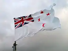 The New Zealand White Ensign (also known as the New Zealand Naval Ensign or the Royal New Zealand Navy Ensign) is a naval ensign used by ships of the Royal New Zealand Navy (RNZN) from 1968. Based on the Royal Navy's White Ensign, it features the Southern Cross from the New Zealand national flag in place of the Saint George's Cross. One of the earliest flags associated with the country, that used by the United Tribes of New Zealand, was a white ensign. This was replaced by the Union Flag when New Zealand became a British colony. A blue ensign with the Southern Cross was introduced for ships of the colonial government in 1867 and this soon became a de facto national flag. Ships in New Zealand naval service wore the Royal Navy's White Ensign until 1968 when the distinct New Zealand White Ensign was introduced. The ensign was implemented out of a desire to distinguish New Zealand vessels from those of the Royal Navy and this decision is regarded as an important step in the development of the RNZN.