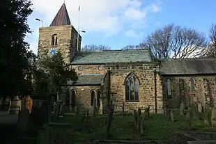 St Michael and All Angels' church was built in a commanding position above the area on the site of an earlier wooden-built church, which was burned down in 1067. Osulf II of Bamburgh attacked Copsi, an appointee of William the Conqueror, setting the church alight and slaying Copsi when he emerged from its door.[6] The current church was built over the course of 30 years, beginning in 1070. Parts of Hadrian's Wall were used in its construction. The church was damaged in another fire in 2006, but the current tower has stood since 1100.[6][19] In the early twentieth century, the Newburn Wesleyan Church was built.[3] This has since been demolished.
