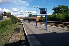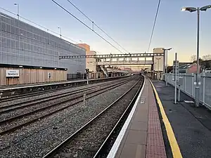 ![]() The station following electrification, showing new footbridge, overhead wires and multi-storey car park (2023) | |