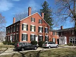 The main body of the three story house is square with a peaked roof. It has five bays on the front and sides, four chimneys, granite footings and door lintels, sandstone window lintels and sills, and granite steps. There is a two-story narrower extension of the main building with a side entrance. The main building has fret work at the cornices and under the eaves. The main house has eight feet of cellar space beneath it.