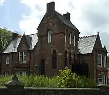 Newmilns' most significant buildings are concentrated in and around The Cross. The townhouse was built in 1739 and is a sign of Newmilns' prosperity during the handloom period.[8] The townhouse steps led to the council chamber, and the side door (on the Main Street) led to the jail underneath. The town bell (housed in the belltower above the building) is engraved with the date 1547, predating the building below.[6] At the far end of The Cross from the townhouse is the Browns Institute, which was given to Newmilns by Ms Martha Brown (of Lanfine) in 1872. Across the road stands the Loudoun Arms, which was built during the 18th century.[8] To the east of The Cross can be found three adjacent buildings, the Commercial Inn, Morton Hall and Lady Flora's, which date to 1869, 1896 and 1875 respectively.[8] Both Lady Flora's and the Commercial Inn have since been turned into housing, but have retained their original facade. The Morton Hall still serves as Newmilns' town hall, however with regionalisation in 1975, responsibility for the hall was transferred to Kilmarnock & Loudoun District Council (now East Ayrshire Council), taking it out of the hands of the Newmilns' townsfolk to whom it had been given.[8]