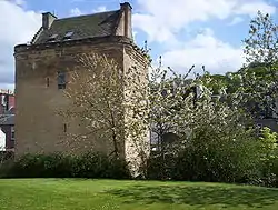 Standing behind The Cross in Castle Street, The Keep (occasionally referred to as Newmilns Tower) is Newmilns' oldest building. The building dates from the 1530s[18] and was probably built by Sir Hugh Campbell (not to be confused with either Hugh Campbell, 1st Lord Campbell of Loudoun or Hugh Campbell, 3rd Earl of Loudoun, who both lived much later). Over its history, The Keep has served many purposes, including being used as a barracks, prison, grain store, doocot, band hall and beer cellar.[8] After falling into a state of disrepair for many years, it was restored in 1997[18] and now exists as housing.