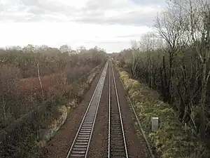 When the Caledonian Railway opened the Cleland and Midcalder Line in 1869, Newpark railway station was the most easterly station on the line around 4 kilometres (2.5 mi) from Mid Calder Junction, with the Caledonian Railway Main Line. It was situated where the Murieston Road crosses over the line.[1] Once was surrounded by fields, the station site is now on the south west edge Livingston, with housing to the north and south of the station site although fields remain to the west. The station site can still be seen from aerial views.