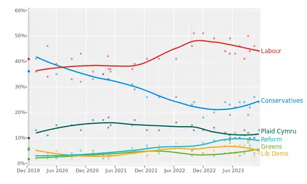 | 20 Oct 2022 | People Polling | 1,237 | 35 | 0 | 4 | 1 | Assumes 40 Welsh seats. Seats will be reduced to 32. |