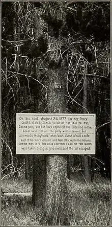 In 1902, Major Hiram M. Chittenden, U.S. Army Corps of Engineers, Yellowstone's chief road builder embarked on a campaign to mark all the historic spots in the park from the 1877 Nez Perce war. By 1904, with the help of participants George and Emma Cowan and others, signs marked the locations of all the key encounters during the Nez Perce flight through the park. By the 1930s, the signs were all gone. The only memorial today is "The Chief Joseph Story" roadside marker where Nez Perce Creek crosses the Grand Loop Road.[22]
