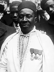 Diouf was elected in 1909 to represent the commune of Rufisque at the advisory General Assembly (Conseil Général) of Saint-Louis, then capital of colonial Senegal.[1] He was an editor of the influential "La Démocratie" newspaper, and founding editor of "Le Sénégal". As a journalist and political leader, he was the political godfather of Blaise Diagne, whose fame and political success quickly supplanted Diouf's own. Diouf and Diagne finally broke in 1928 over Diouf's view that Diagne had conceded too much to French interests, and over Diouf's increasingly anti-Communist and anti- French Socialist Party views. With the death of Blaise Diagne, Ngalandou Diouf was in 1934 elected to the French National Assembly, the seat formerly held by Diagne, leading a coalition of the Centre Left, small farmers, Senegalese veterans of the French military, and followers of the Tijaniyyah Sufi brotherhood which defeated the Socialist and Mouride brotherhood coalition of Lamine Guèye, the attorney who would later carry out much of Diagne's political program.[2]