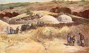 Many versions in the historiography of southern Africa state that during the South African upheaval known as Mfecane, the Nguni people spread across a large part of southern Africa, absorbing, conquering, or displacing many other peoples. However, the notion of the mfecane or difaqane has been disputed by some scholars, notably Julian Cobbing.[16] The Mfecane was initiated by Zwide and his Ndwandwes. They attacked the Hlubi and stole their cattle, leaving them destitute. The remnants of the Hlubi, under their chief Matiwane fled into what is now the Free State and attacked the Batlokwa in the Harrismith Vrede area. This displaced the Batlokwa under Mmanthatisi, and she and her people spread conflict further into the central interior. Moshoeshoe and his Bakwena sought the protection of Shaka and sent him tribute in return. When Matiwane settled at Mabolela, near present-day Clocolan, Moshoeshoe complained to Shaka that this prevented him from sending his tribute, whereupon an impi was sent to drive Matiwane from this area. Matiwane fled south and raided one of the Xhosa kingdoms, which got his whole tribe annihilated by Paramount Hintsa, at the Battle Of Mbholompo. Mmanthatisi and her Batlokwa settled near what is now Ficksburg and were followed by her son, Sekonyela, as chief of the Batlokwa. It was he who had stolen Zulu cattle that Piet Retief in his dealings with Dingane, Shaka's successor, retrieved. After the defeat of Zwide and his Ndwandwes by Shaka, two of his commanders, Soshangane and Zwengendaba, fled with their followers northward, engaging in conflict as they went. Soshangane eventually founded the Shangane nation in Mozambique and Zwengendaba moved all the way to what is now Tanzania. Mzilikazi in his flight from Shaka, depopulated the eastern highveld and northern Free State, killing the men and capturing the women to form his Matabele nation. Initially, he settled near what is now Pretoria, then moved to Mosega, near present day Zeerust, but after his defeat by the Voortrekkers he moved to present-day Zimbabwe where he founded his capital, Bulawayo.[17]