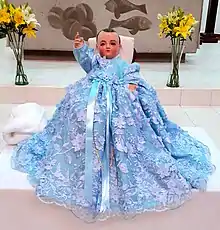 The traditions surrounding the image have not changed much in the over 400 years even though Xochimilco has transformed from a rural area to an urban one.[1] As it is associated with popular religious expression and because of this, it does not reside in a church but rather with a family.[1][4] It is part of popular religious expression and not official Church doctrine. Because of this, the image does not reside in a church but rather in the home of a family. He is “laid down to sleep” each night in a basket made for him, in his underclothes and wrapped in a blanket. Each morning, he is “awoken” to Las Mañanitas before he is dressed.[1] Each evening it attends Mass before heading back to the home of the mayordomo.[4] Since 1995, the image has been taken once a year for a “check up” with the “pediatrician,” which is annual examination, including X-ray and maintenance work done by INAH.[2] The image is hosted by a sponsor or “mayordomo” each year in the family home, often in a room built especially for the purpose. This area is open to the public with all free to come and go.[1][2] It is believed that those who become a mayordomo of the image receive blessings and prosperity.[3] The waiting list to host the image extends past 2040 and families have waited as much as fifty years.[2][7] If the person on the waiting list dies beforehand, the privilege is inherited by another member of the family.[3] Families who have hosted the image receive a life-sized copy.[7]
