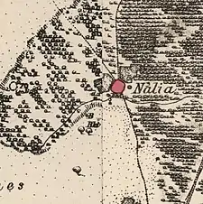 In 1863 Victor Guérin found it to be a village with 300 inhabitants. The village had a mosque which contained ancient fragments, such as trunks of marble columns.[13] An Ottoman village list from about 1870 showed that Na'lija had 39 houses and a population of 111, though the population count included men, only.[14][15]
