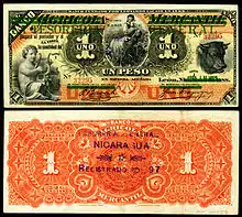 The peso was the currency of Nicaragua between 1878 and 1912. It was Nicaragua's first national currency, replacing the Central American Republic real and that of neighbouring states. It was subdivided into 100 centavos and when it was introduced, it was worth 8 reales, and had the same weight and mass as the peso fuerte, but due to recurrent devaluations, it was replaced by the córdoba at a rate of 12+12 pesos = 1 peso fuerte = 1 córdoba.