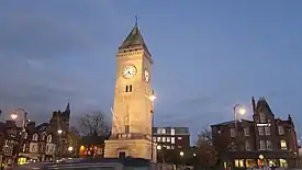 It is a Grade II listed[3] building in the form of a red-brick tower[2] clad in Portland stone,[1] with four 2.06 metres (6.8 ft) diameter,[1] illuminated clock faces.[3] There are decorative wrought iron and bronze gates and lamp standards.[3] It was designed by Thomas Worthington & Sons, of Manchester,[1] with tablets designed by The Birmingham Guild of Artists.[1] It was built by Messrs E & A Frith of Macclesfield and Mr Thomas Grace of Leek.[1] The ironwork was made by a blacksmith called Mr Hart, of Salford.[1]