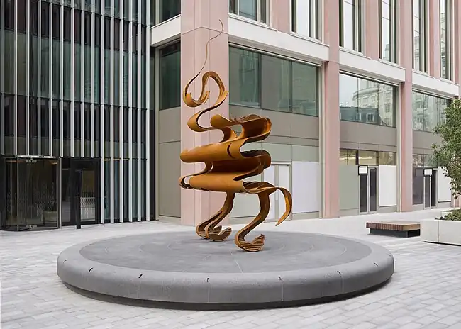 "Twofold" was commissioned by Harlow Art Trust. It is the 100th piece in Harlow's public sculpture collection[6] which includes works by Auguste Rodin, Barbara Hepworth, Henry Moore, and Elizabeth Frink, among many others, so is a fitting environment for an artist whose subject is frequently the canon and its construction. For this commission, Hornby has crossed one of the most canonic of figurative sculptures, Michelangelo's David, with a curving line from a 1925 Kandinsky drawing. In one rotation, David is visible; in another, it is Kandinsky's abstract line.