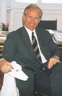 In 1988, Trussardi outfitted the Italian athletes competing in the 1988 Olympic Games in Seoul, South Korea.[6] Then in 1989, Trussardi used his collection to protest both the deforestation of the world's rainforests, and the use of real animal fur by his contemporaries. He used exclusively faux-fur, and included letters of protest against deforestation in the entrance bags given to the attendees of that year's fashion shows.[7] Throughout his career, Trussardi spent time promoting the marketing phrase "Made in Italy" and Italian fashion in general.[3] By the time of Trussardi's death in 1999, his business was worth about $480 million.[8] He was also a costume designer for play productions staged in both Europe and the United States.[9]