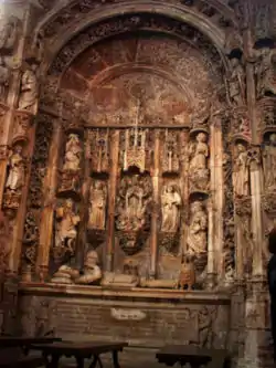 The damaged retable in the Renaissance chapel of St. Peter in the Old Cathedral of Coimbra is also attributed to Chanterene. (sometimes to Jean de Rouen). The central theme of the elegant decorations and carvings is Quo vadis ? (Where are you going ?)