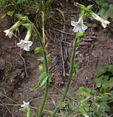 Nicotiana clevelandii is a glandular and sparsely hairy annual herb producing a slender stem up to about 60 centimetres (24 in) in maximum height. The leaf blades may be 18 centimetres (7.1 in) long, the lower ones borne on petioles.