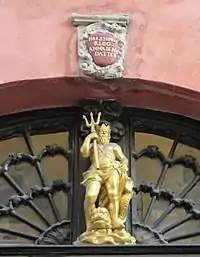 The building seen today is constructed with four storeys over a walk-out basement, It is 11 bays wide and the red tile roof features six dormer windows towards the street and four dormer windows towards the courtyard.[1] The facade is rendered in a pale red colour and is finished with a white cornice under the roof and a white belt course above the ground floor. A short granite staircase in the fourth bay from the left provides access to the main entrance and a short granite staircase at the eighth bay leads down to a separate entrance to the cellar. A gateway on the right side of the building opens to a small courtyard. In front of the fanlight stands a gilded statuette of Neptune. The keystone above the gate features the names Christopher Klog and Anna Jensdatter.[11]
