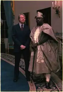 Nigeria–U.S. relations improved considerably from 1977, largely because of the election of Jimmy Carter as U.S. president. Carter's foreign policy on Africa has been characterised as differing significantly from that of his predecessors – not only in its emphasis on Africa,[44] but also in its resistance to the Cold War realpolitik of the Kissinger era, which, in the words of Cyrus Vance, Carter's Secretary of State, treated Africa "as a testing ground of East–West competition".[45][30] Instead, Carter sought to project the U.S.'s liberal image abroad, emphasising principles of global justice and human rights; he also publicly denounced apartheid, and criticised the Ford administration's strategy in the Angolan Civil War.[46][45] Additionally, Carter appointed as U.S. ambassador to the United Nations a young black Congressman, Andrew Young, who had pre-existing[46] personal friendships with both Lieutenant General Olusegun Obasanjo, the Nigerian head of state, and Brigadier Joe Garba, the Nigerian Commissioner for External Affairs.[37][26] More generally, the U.S., and its ambassador to Nigeria, Donald B. Easum, emphasised the U.S.'s intention to consult Nigeria closely on its foreign policy elsewhere in Africa.[26][44] The effect of both changes was "an opportunity for a fresh start" in Nigeria–U.S. relations.[26] Moreover, circumstances might have led Nigerian leaders to reconsider their hardline foreign policy stance: both the deterioration of the Nigerian economy, and the poor progress of Southern African liberation movements, made diplomatic rapprochement with the U.S. an appealing and even necessary course.[29] Carter's determination to curb dependence on foreign oil imports, combined with a damaging fall in Nigerian oil earnings due to a global supply glut, also made it important to shore up Nigeria's economic ties to the U.S.[47] (And, indeed, in 1977, more than 80% of Nigerian oil exports went to the U.S.)[48]