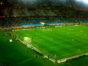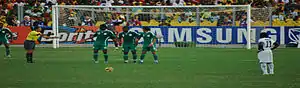 Nigeria lost its opening match against Argentina 1–0 at Ellis Park Stadium following a controversial Gabriel Heinze header in the 6th minute.[9][10] In its second game Nigeria led early on by a goal from Kalu Uche. A red card against Sani Kaita gave Greece the advantage. Greece scored the equaliser late in the first half and Nigeria conceded the second goal in the second half and lost the game 2–1. In their last group stage match against South Korea, Nigeria took an early lead in the 12th minute off of a great finish by Kalu Uche after a low cross from Chidi Odiah. However, goals from Lee Jung-Soo and Park Chu-Young gave South Korea a 2–1 lead, which looked to be enough for South Korea to advance into the round of 16. However, Nigeria got a chance in the 66th minute, on the end of a pass from Ayila Yussuf that was fed through the South Korean defense was none other than Yakubu, once the pass found Yakubu's foot about four yards away from the empty goal, Yakubu pushed the ball wide of the left post to leave South Korea still ahead 2–1. Three minutes later, Yakubu was able to calmly finish a penalty to knot the score at two apiece, but Nigeria was unable to score again and the match ended in a 2–2 draw. With this result, Nigeria was eliminated from the 2010 World Cup with just one point, while South Korea advanced into the round of 16 with four points. On 30 June 2010, following the team's early exit and poor showing, the then President of Nigeria, Goodluck Jonathan suspended the national football team from international competition for two years.[11] This suspension put the team at risk of being banned from international football by FIFA for reasons of political interference.[12]