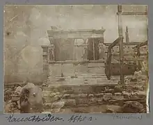 Balanos' final restorations were of the Temple of Athena Nike, which he began in 1935. The temple had originally been reconstructed under Ludwig Ross and Kyriakos Pittakis between 1835 and 1847,[5] but sudden subsidence under its crepidoma had left it in danger of collapse.[6] Balanos dismantled the temple, and rebuilt it up to the orthostates, making a tentative restoration of the upper parts of the temple which was later completed by Anastasios Orlandos in 1940.[7] Along with the German archaeologist Gabriel Welter, Balanos excavated the tower on which the temple was built, as part of which he found remains of the Mycenaean fortifications of the acropolis as well as traces of the worship of Athena from the Archaic period.[7] In 1939, Balanos' own ill health and the approach of the Second World War forced him to abandon the project.[6]