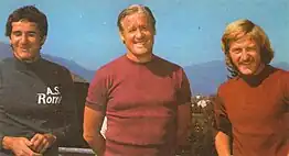 AS Roma coach Nils Liedholm poses in the 1975–76 preseason between the team's two new acquisitions, forward Carlo Petrini (left) and midfielder Loris Boni (right).