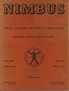 Nimbus: A Magazine of Literature, the Arts, and New Ideas began publication in December 1951 as a quarterly magazine[3] of new writing. Tristram Hull, son of R. F. C. Hull, poet and translator of the Collected Works of C.G. Jung, acted as editor for the magazine's four volumes of thirteen issues. Hull was later joined by co-editors Ivo Jarosy, 1953–1954, and David Wright, 1955–1957[4] and Martin Green (author, 1951–1957) when the magazine was published from Martin's flat: 20 Shipley House, SW8 (Nimbus Issue No.1 Dec 1951) During this period Wright & Green published 19 poems by Patrick Kavanagh, sent to Wright by Patrick Swift, which proved to be the turning point in Kavanagh's career.[5] Due to editorial differences between Wright and Hull, Christopher Logue, in 1957, became co-editor with Hull and the name of the magazine was changed to Nimbus: New English Review.