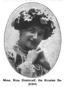 - ↑ "Nina Dimitrieff Sings" New York Times (November 12, 1916): 19.