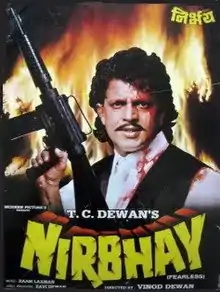 Nirbhay is a 1996 Indian Hindi-language action thriller film directed by Vinod Dewan,[1] starring Mithun Chakraborty, Sangeeta Bijlani, Sadashiv Amrapurkar, Kulbhushan Kharbanda, Anupam Kher, Paresh Rawal and Kiran Kumar.[2][3] Infamous Mumbai bar girl, Tarannum Khan, may have a small role in this movie. This was before she shot to fame due to her involvement in cricket betting syndicates.[4]