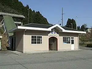 The station has one side platform serving a single bidirectional track located on an embankment, with the station building at a lower level. The station is unattended.