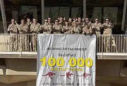 Members of the No. 44 Wing detachment responsible for air traffic control at Baghdad International Airport celebrate their 100,000th air movement in January 2004