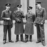 London, November 1943. The all-British/RAF crew of 466 Sqn Wellington "HD-L" at Buckingham Palace, about to receive medals resulting from their mission on 14 April: Flying Officer Raymond Hopkins DSO of Newport, Wales (left); Pilot Officer Frederick Blair DFM of Belfast, Pilot Officer Edward Hicks CGM of Newbury Park, Essex and Flying Officer Reginald Clayton DFC of Carshalton, Surrey.