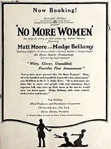 No More Women is a 1924 American silent comedy film directed by Lloyd Ingraham and starring Matt Moore, Madge Bellamy, and Kathleen Clifford.[1][2]