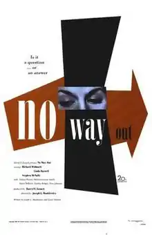 No Way Out is a 1950 American film noir crime drama film[3] directed by Joseph L. Mankiewicz, and starring Richard Widmark, Linda Darnell, Sidney Poitier, and Stephen McNally, who portrays a doctor tending to slum residents whose ethics are tested when confronted with racism, personified by Widmark as hateful robber Ray Biddle.[4]
